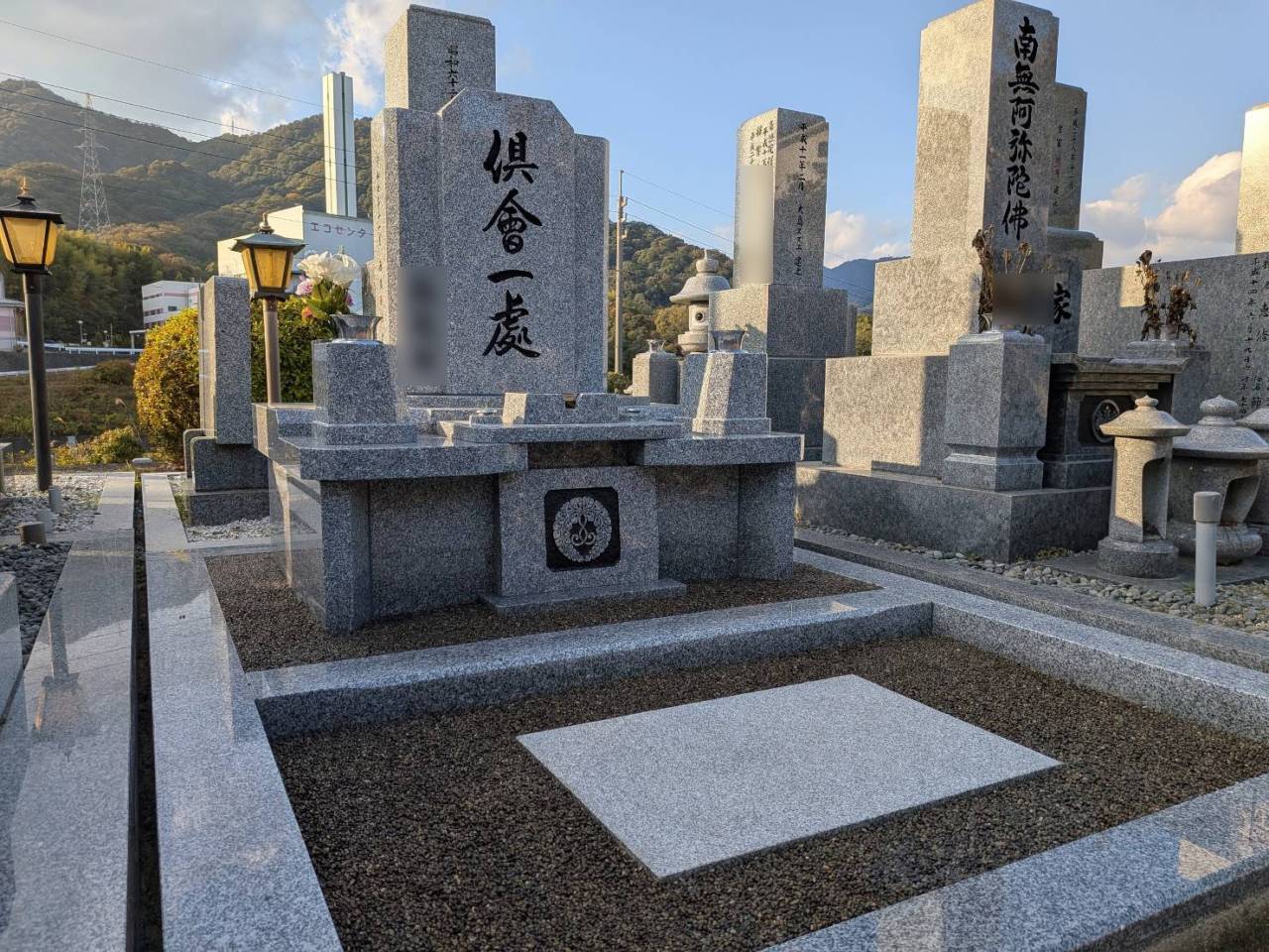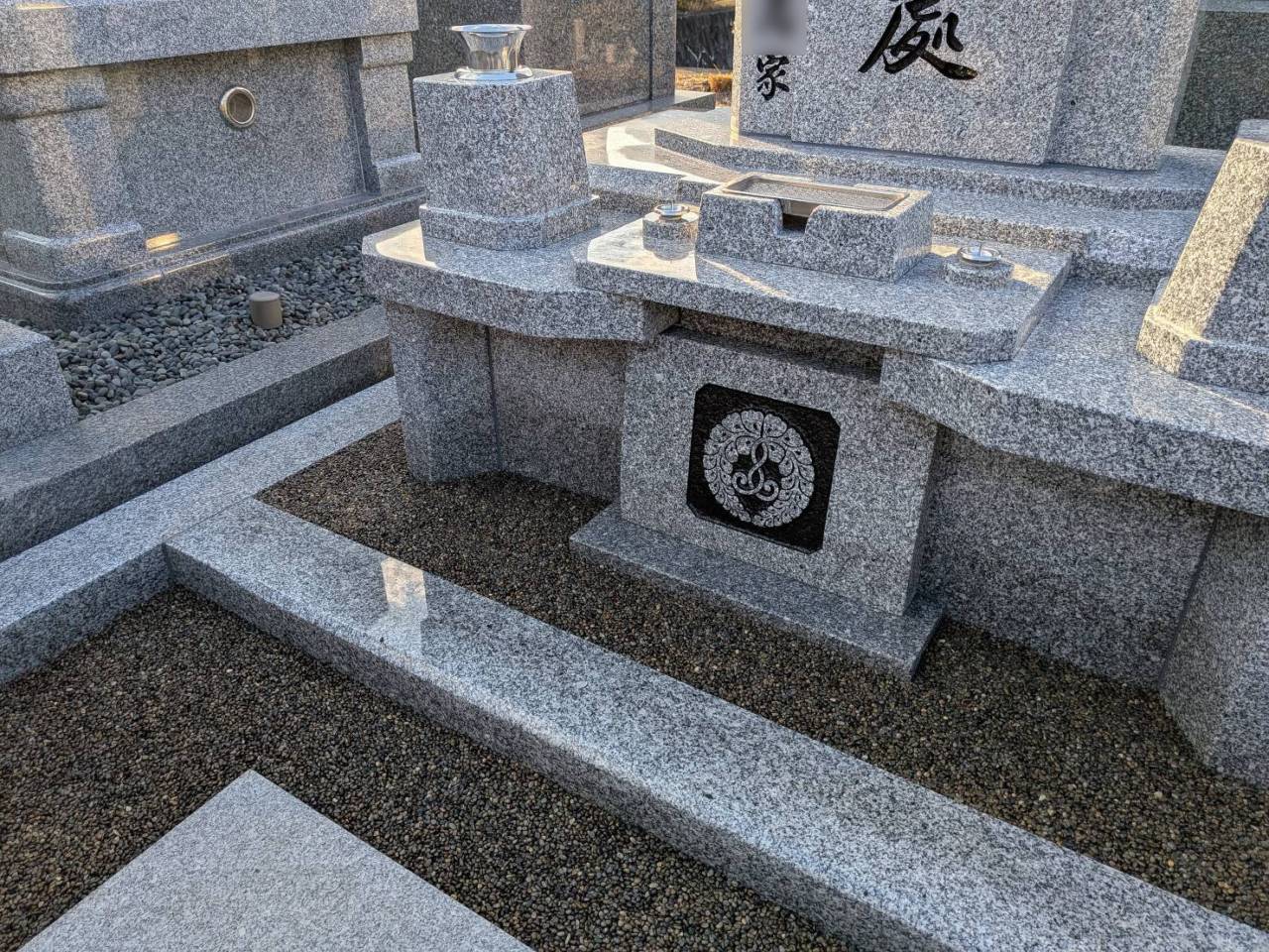 家紋や文字彫刻も深彫りで陰影がしっかり出ており、正面から見た際のアクセントとして非常に効果的です。細部まで丁寧に加工・据付を行ったことで、どこから見ても均整の取れた、美しいお墓に仕上がりました。